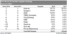 在2017年全球逆變器105GW出貨量中,中國市場獨占55GW。搶占地緣優勢,此次逆變器十強榜單中,“中國軍團”共拿下七席。