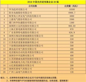 本次榜單包含七大類榜單,其中2016中國光伏逆變器企業20強排名如下:華為技術有限公司以出貨量10500兆瓦位居第一名,陽光電源股份有限公司出貨量8906.7兆瓦和特變電工西安電氣科技有限公司出貨量4000兆瓦進入前三。