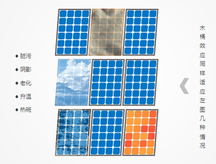第一,避免了集中型逆變器電站的木桶效應(如下圖)。集中式并網逆變系統中,組件方陣經過兩次匯流到達逆變器,逆變器最大功率跟蹤功能(MPPT)不能監控到每一路組件的運行情況,因此不可能使每一路組件都處于最佳工作點,當有一塊組件發生故障或者被陰影遮擋,會影響整個系統的發電效率。所以當電池組件受到遮擋時,集中型電站會受到較大的影響,組串型電站只有被遮擋的一串對應的一路MPPT受到影響。而正常情況下,各個組件之間的安裝間距,安裝角度各異,一天中一定時間內不可避免會產生局部遮擋,特別是早晚時刻太陽高度角較低的時候,或者出現一些植被遮擋一些電池片。若一個500KW方陣的電池板使用一路MPPT來跟蹤,會損失一定的發電量。該情況同樣適用于當電池組件發生臟污、陰影、老化、升溫、熱斑的情況下。